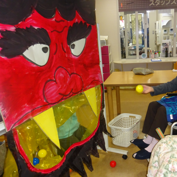 「福は内」「鬼は外」と声を出し、鬼の的でボール投げ。前のめりになり黙々と投げる方、「私は下手だから」と隣の方へボールをあげる方、優しくそっと鬼へ手渡す方など、皆さん楽しそうに参加されていました。