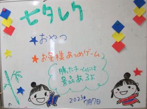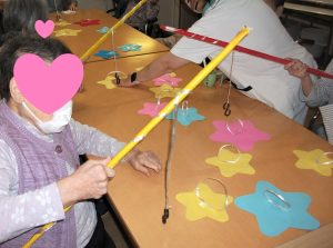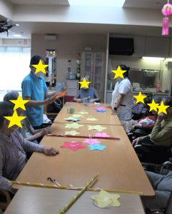 七夕の会🎋 2023/7/09 日曜日 行事 7月7日、七夕の会を行いました。 短冊には入居者の皆様の願い事✨ 七夕の飾り付けも好評でした✌ ゲームは『お星様集め☆彡』 星の裏側には点数が書いてあり、たくさん星を集めて、合計点を競いました😊 とても盛り上がりました😊 これからも入居者の皆様に楽しんで頂ける企画を考えていきたいです💪 特別養護老人ホーム くすのき