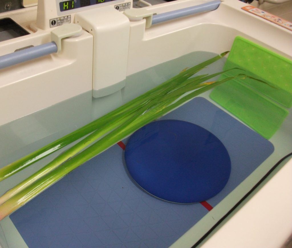 「菖蒲の根元を割くと匂いが強くなるよ」「昔、よくやったよ。」など、お風呂に入りながら