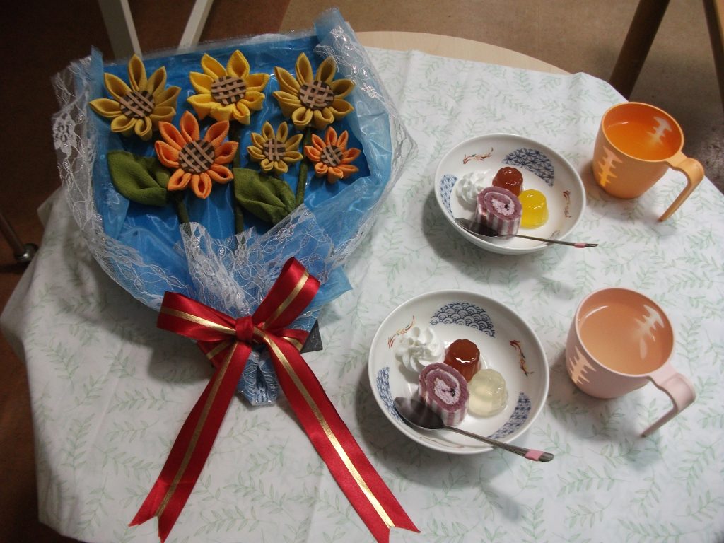 スイカ割りの後はブドウ味のロールケーキとゼリー添えを召し上がっています🍴😋