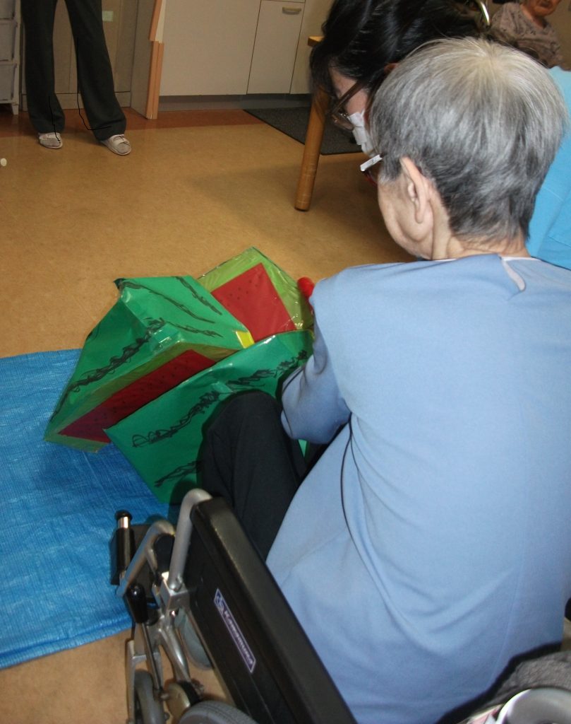 職員が作ったスイカを一人ずつ割ってもらいました。