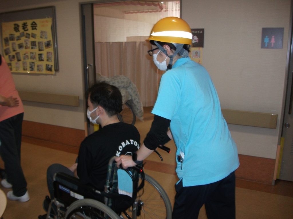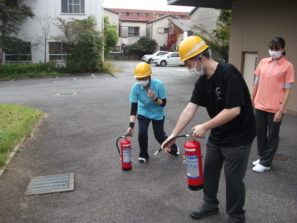 10月は避難訓練と一緒に水消火器を使った訓練、シーツなどを使用した移動法などを行いました。