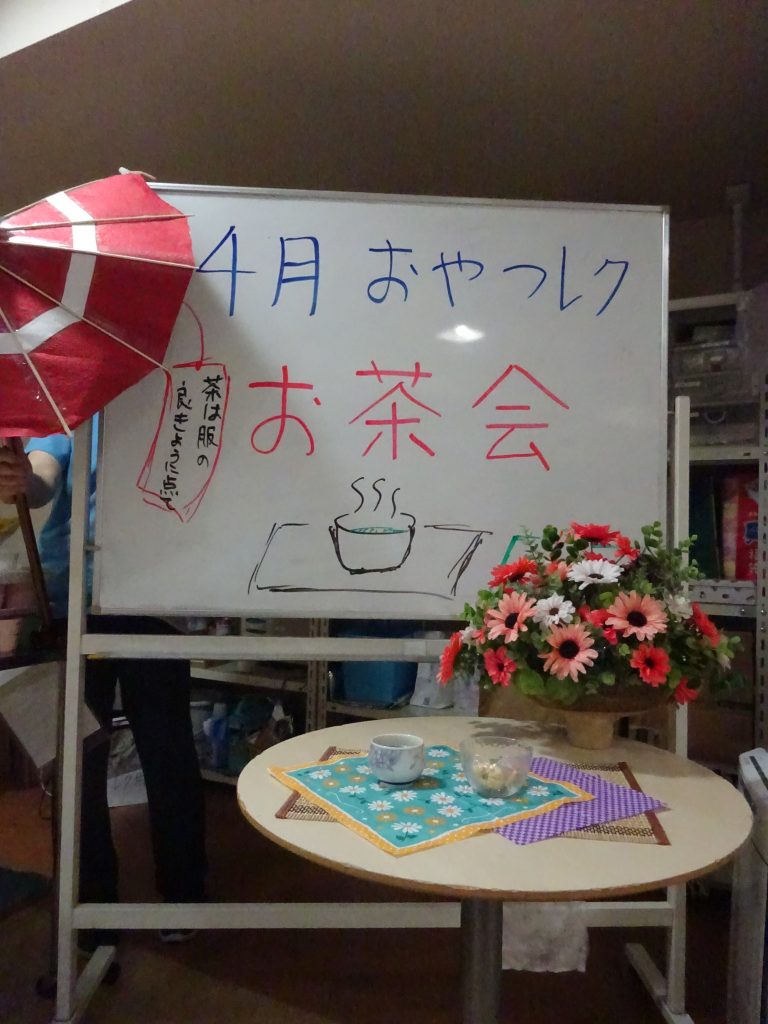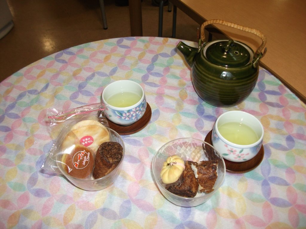 今月のおやつレクはお茶会を行いました。抹茶の粉末を使用し、一人ずつ提供させていただきました。