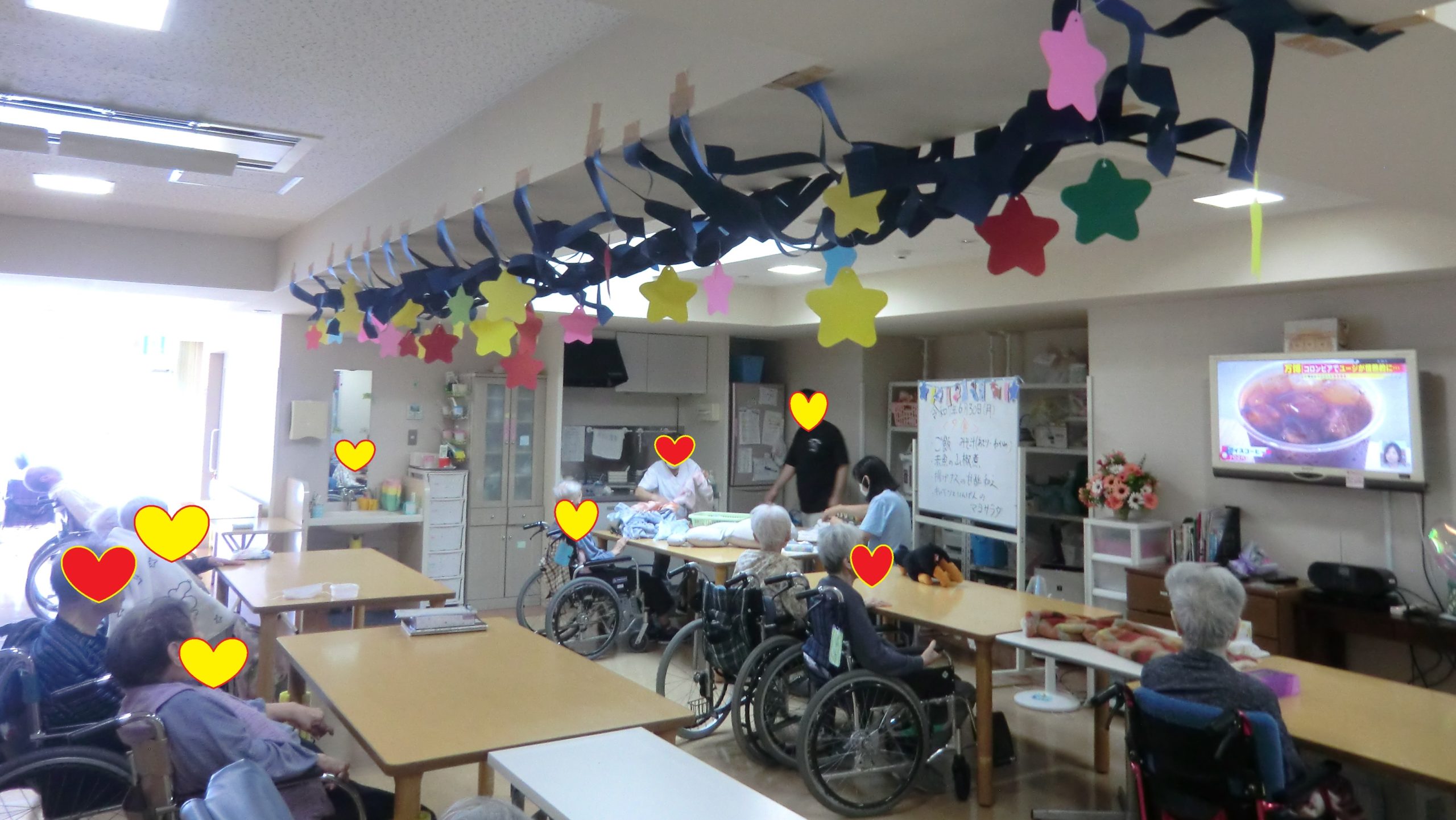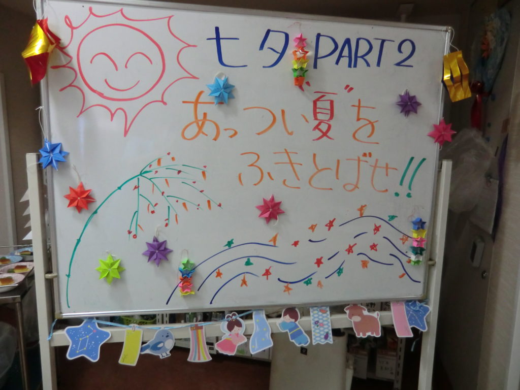 笹をフロアと施設の出入り口に飾り、短冊を飾りました。「みんなが幸せでありますように」「世界平和」「パンが食べたい」など、様々な願い事が短冊には書いてありました😊