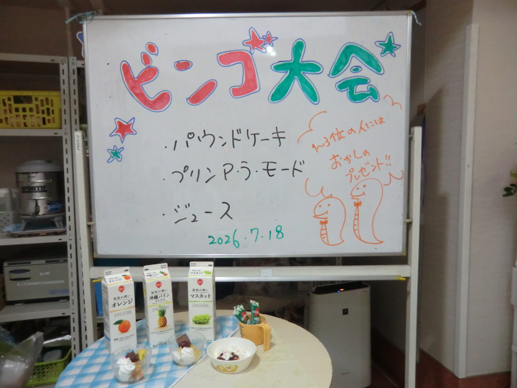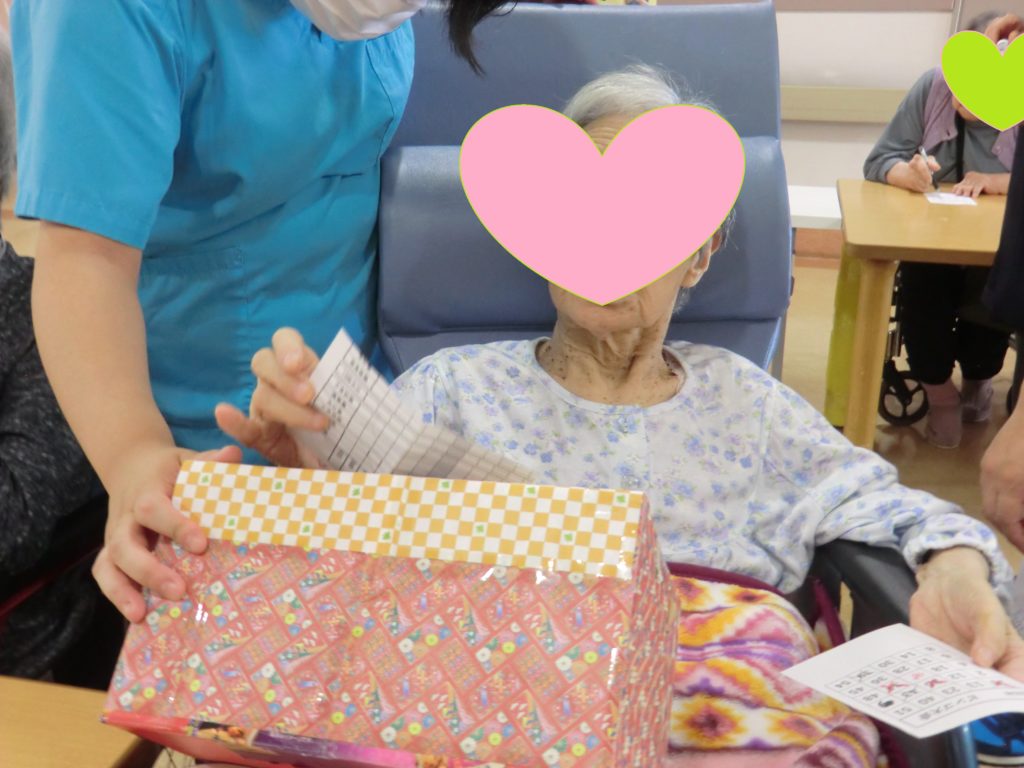ビンゴ大会では、一人ひとりビンゴの数字の書いた紙の入った箱から一枚選んでいただき、読み上げていただきました。